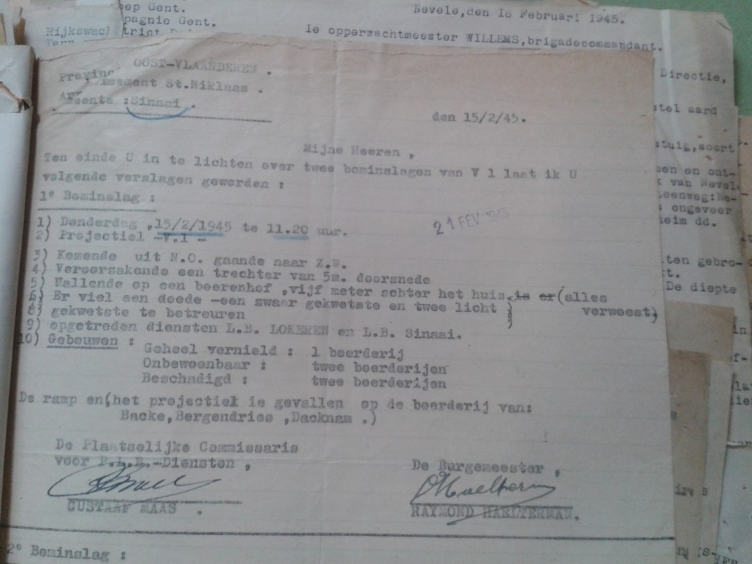 Ik ben geboren en getogen op de Bergendries, en woon er trouwens terug. De opsteller van dit PV is de latere rijkswachtcommandant van Lokeren, dhr Rochtus. Deze werd mijn overbuur gedurende een aantal jaren. De exacte plaats van de impact kan ik niet meer achterhalen; daarvoor is de wijk té veel veranderd.