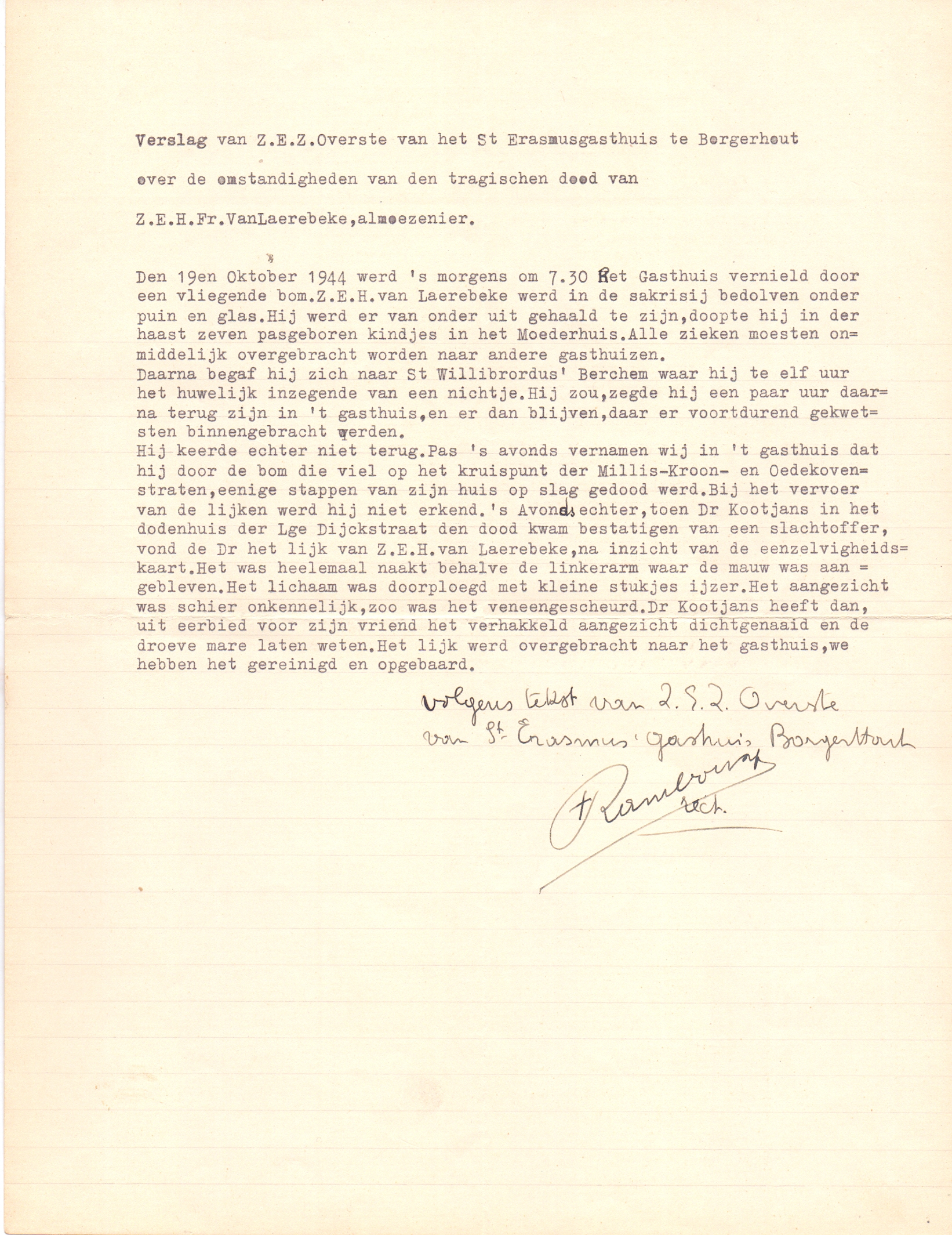 Er waren twee doden bij deze V2-inslag (ook al wordt er soms gesproken van een V1) in Borgerhout. Een van de overlevenden was E.H. Frans Van Laerebeke, de aalmoezenier van het Erasmus ziekenhuis. Via Luc Int Panis vond ik wat hem enkele uren later overkwam in de Kroonstraat (zie deze link voor info over die inslag):