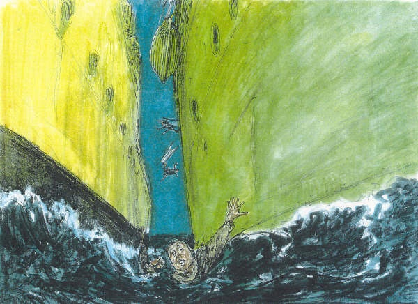De Leopoldville hing nu zo over naar bakboord dat de soldaten niet meer konden rechtstaan. Net als Daniel probeerden ze de railing vast te grijpen. Sommige soldaten wilden zich verlossen van hun zware helm en munitie, maar het weggesmeten materiaal kwam terecht op de mannen in de zee. Luitenant Wurdeman die de torpedo in het begin had zien inslaan, was nog steeds aan boord: “Het grotendeel van de mannen verpletterde tegen de rails aan stuurboord toen ze paniekerig het schip wilden verlaten. Ik ben zeker dat enkele van mijn mannen zo stierven. Net toen het water op het dek kwam, sprong ik in een sloep die op het dek lag. Het water deed de sloep van het schip wegdrijven en ik kon vijf mannen in de boot helpen.”[6]