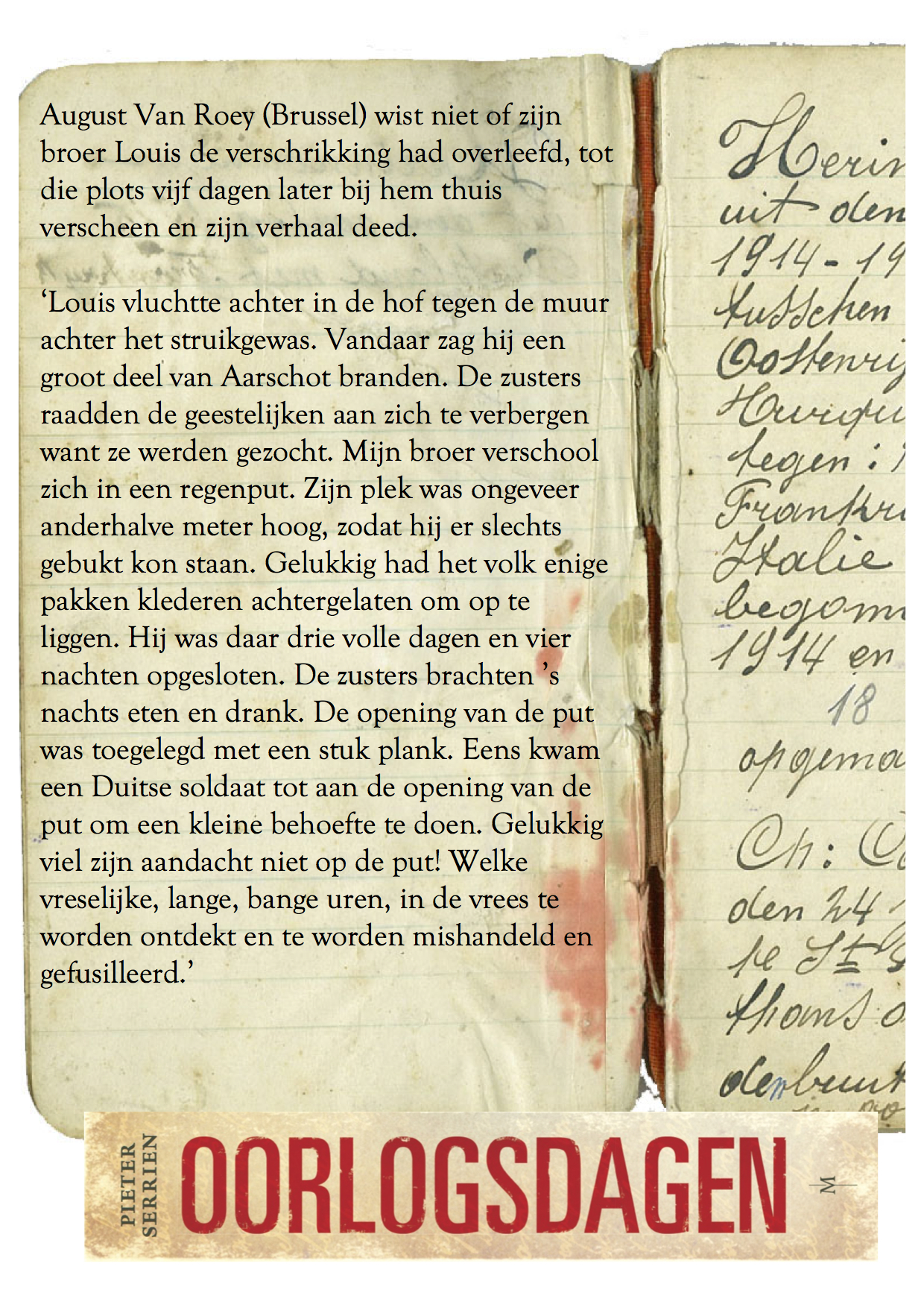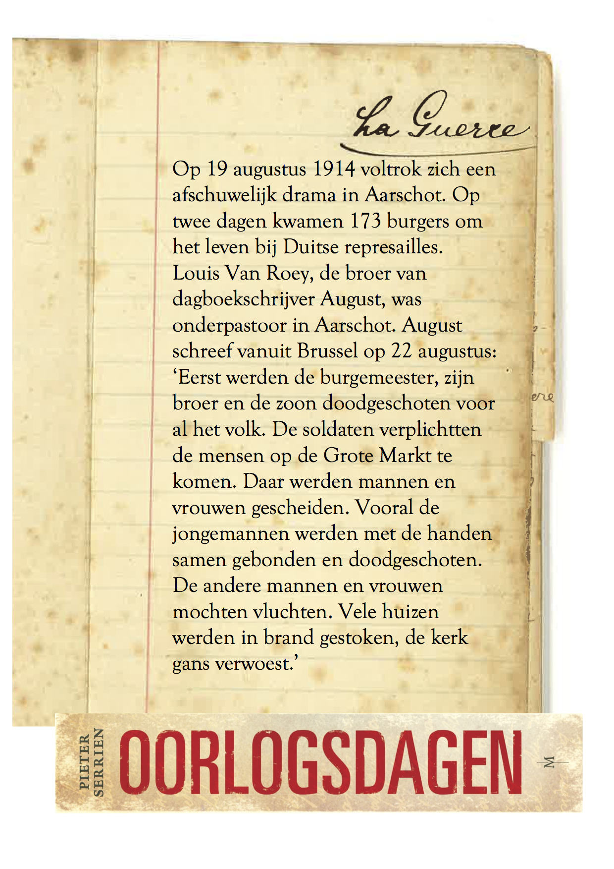 Vandaag honderd jaar geleden… kwamen in Aarschot 173 burgers om het leven na twee dagen Duitse represailles. ‘Man hat geschossen!’, klonk het op de Grote Markt nadat een Duitse generaal was doodgeschoten. De invallers duidden de zoon van de burgemeester aan als dader. Dagboekschrijver Jan De Belser noteerde een getuigenis die hij tijdens de oorlog vernam: ‘Ik werd aangehouden en op de Grote Markt gebracht waar de burgemeester ons geruststelde: “Het zal beter vergaan dan ge denkt, ik zal mijn best doen.” Maar ’s anderendaags werden zoveel onschuldigen doodgeschoten.’