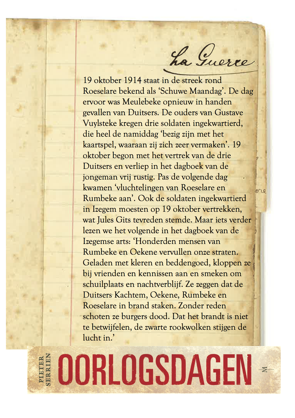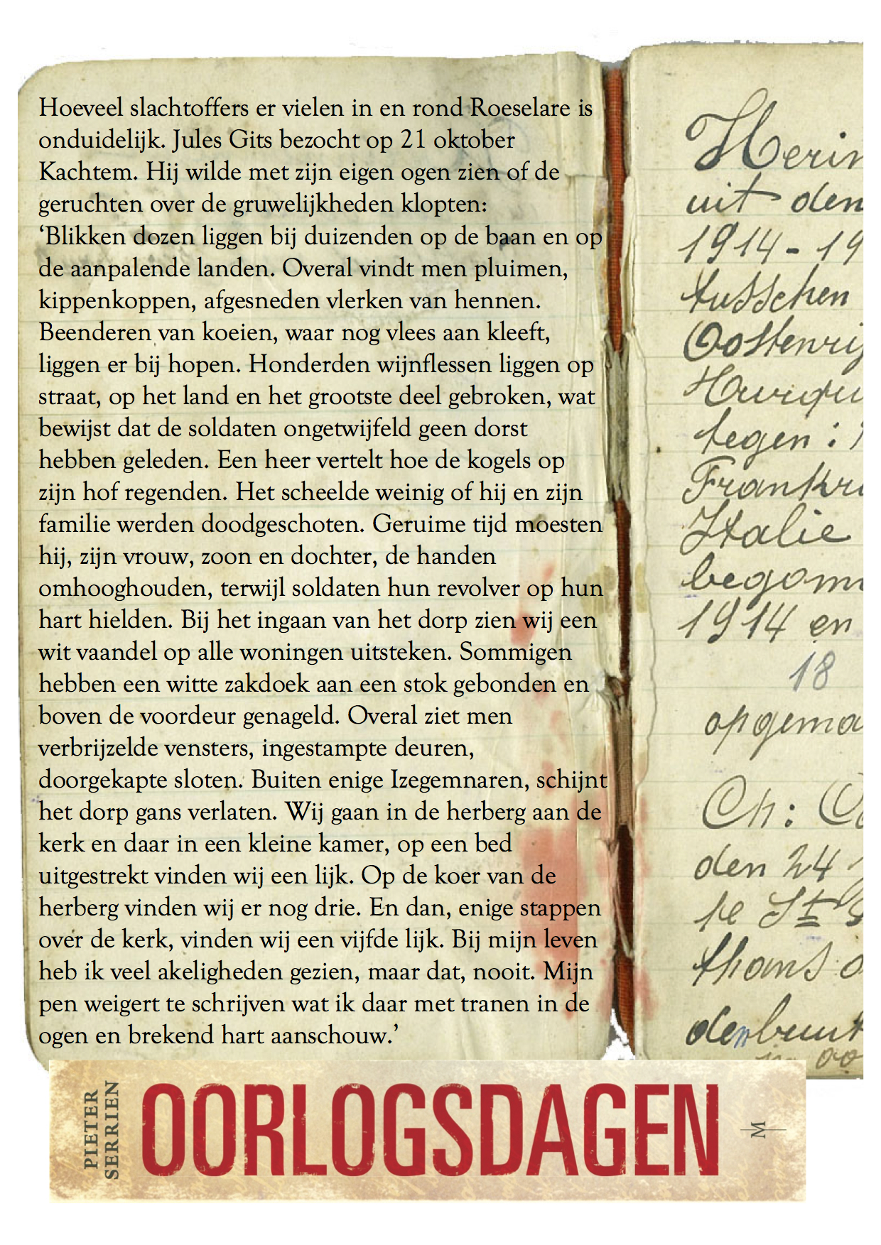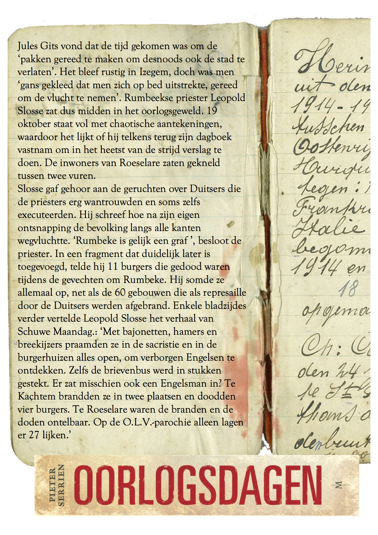 Vandaag honderd jaar geleden… lag de streek rond Roeselare plotseling in het midden van het oorlogsgeweld. De dagboekschrijvers Jules Gits in Izegem, Gustave Vuylsteke in Meulebeke en Leopold Slosse in Rumbeke maakten het van dichtbij mee.