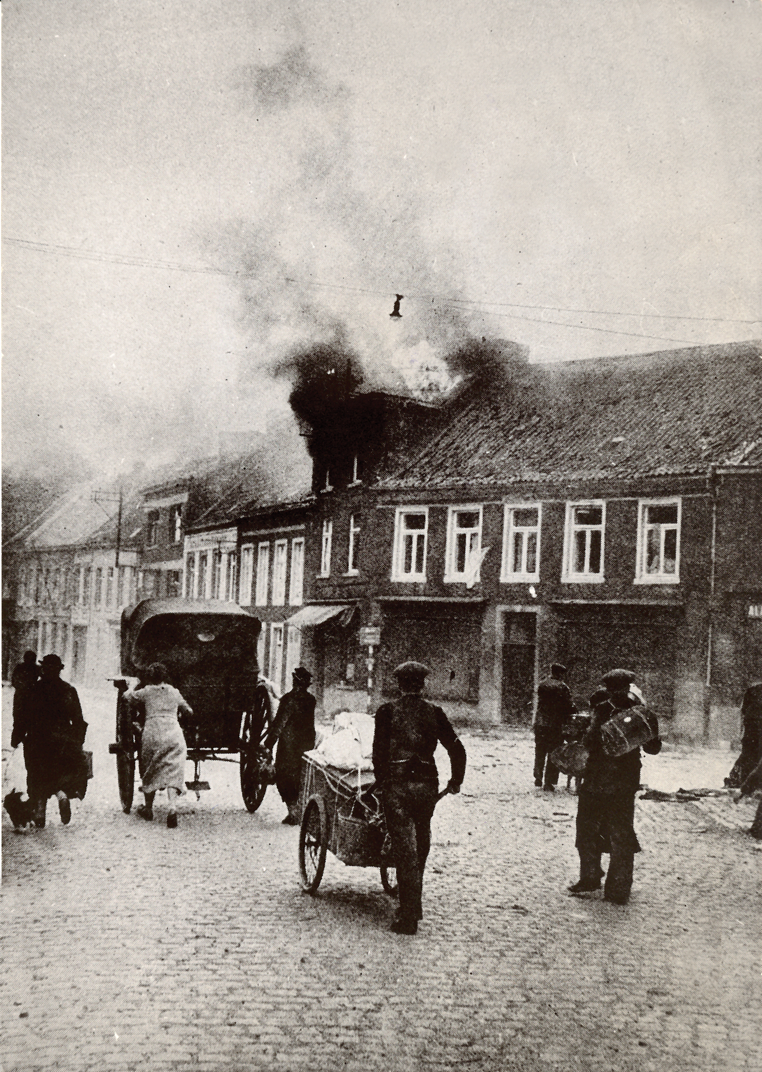 ‘De oorlog stonk!’ roept Theo (°1935, Kieldrecht) uit. ‘Hij bracht bepaalde geuren met zich mee die je deden voelen dat er iets was veranderd. Geuren die we ervoor niet kenden, zoals stookolie, stof, brand en etter.’ Reeds jaren voor de oorlog bestond het idee dat een blitzkrieg met gemotoriseerde landtroepen en hevige bombardementen de strijd zou beslechten. ‘Het was de Duitse tactiek om schrik aan te jagen’, beweert Lucien (°1929, Houthulst). ‘De eerste twee dagen strooiden ze overal brandbommen en fosforbommen rond. Op 10 mei werd de kerk van Staden gebombardeerd en het hart van Diksmuide brandde. Veel mensen fietsten daarheen uit nieuwsgierigheid. Het was niet gevaarlijk, tenzij Stuka’s opdaagden, dat waren de Duitse jachtvliegtuigen die zich steil naar beneden recht op hun doel stortten.’