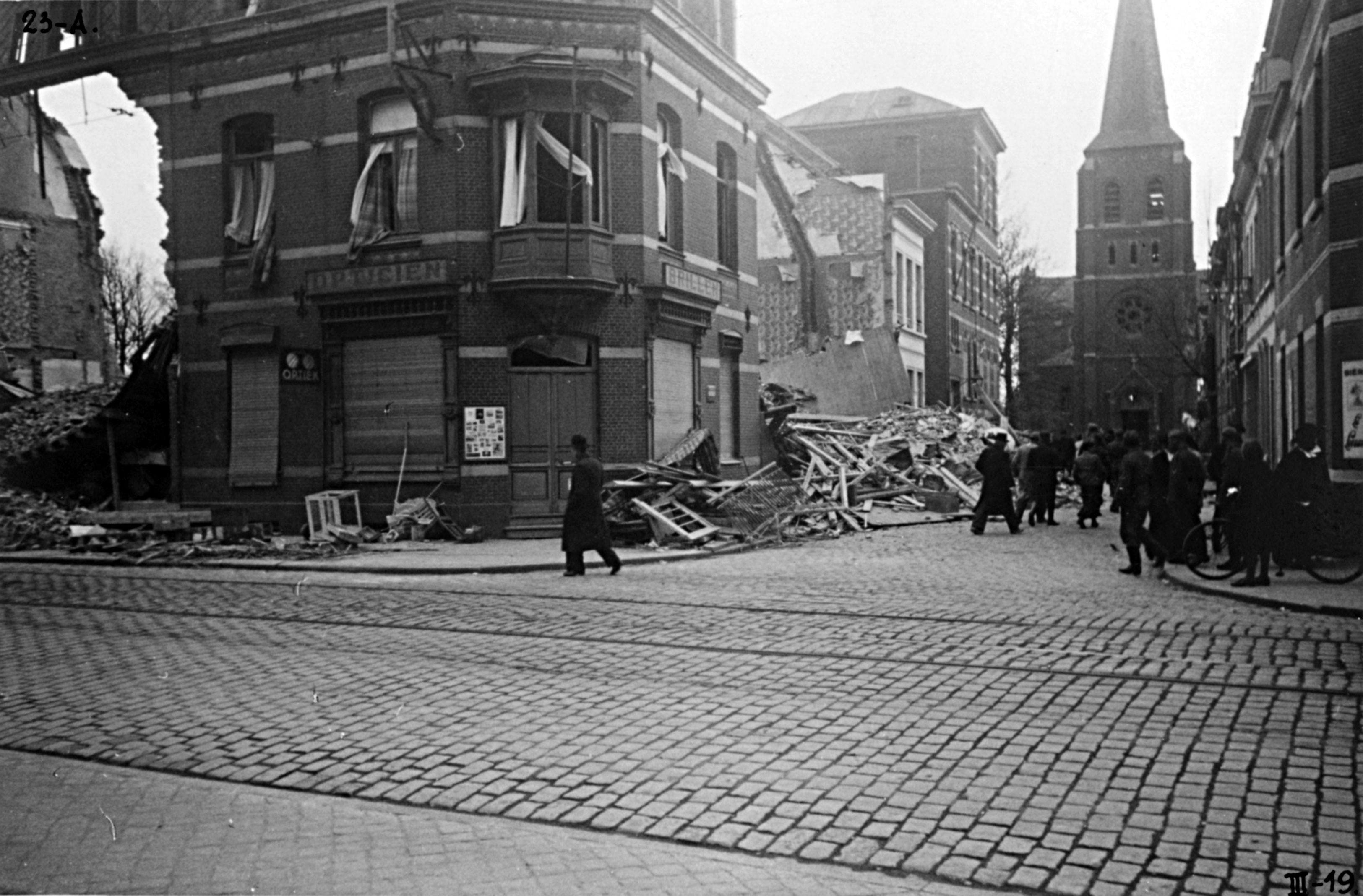 In Mortsel. Alle 23 kleutertjes overleefden het bombardement. De zingende juf had hen gered, terwijl op enkele meters van hen een bom meer dan honderd van hun schoolgenootjes had gedood.
