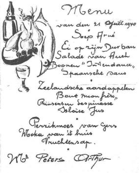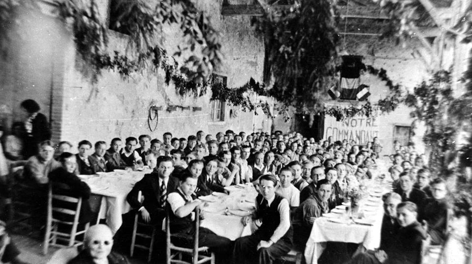 In de namiddag volgde een ‘prachtig diner, smakelijk en overvloedig eten. Heel het kantonnement is in gezellig samenzijn’. In het dagboek staan foto’s van het feestmaal. We zien drie lange, mooi gedekte tafels en tientallen jonge gezichten die naar de lens gericht zijn. Achteraan hangt, onder de Belgische en de Franse vlag, een groot spandoek met ‘Vive notre commandant’. Het rijk geïllustreerde en aan alle jongens uitgedeelde menu klonk erg internationaal.