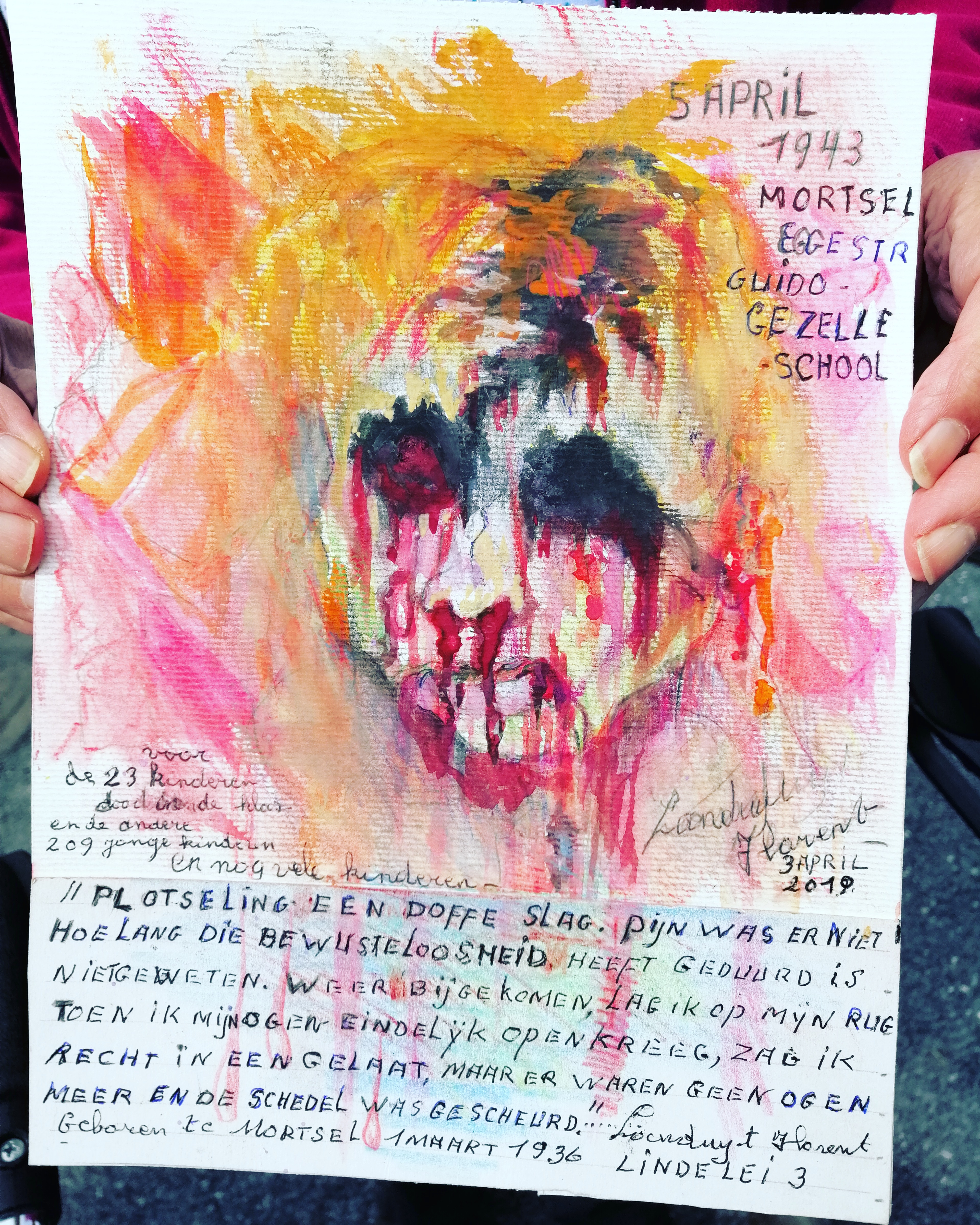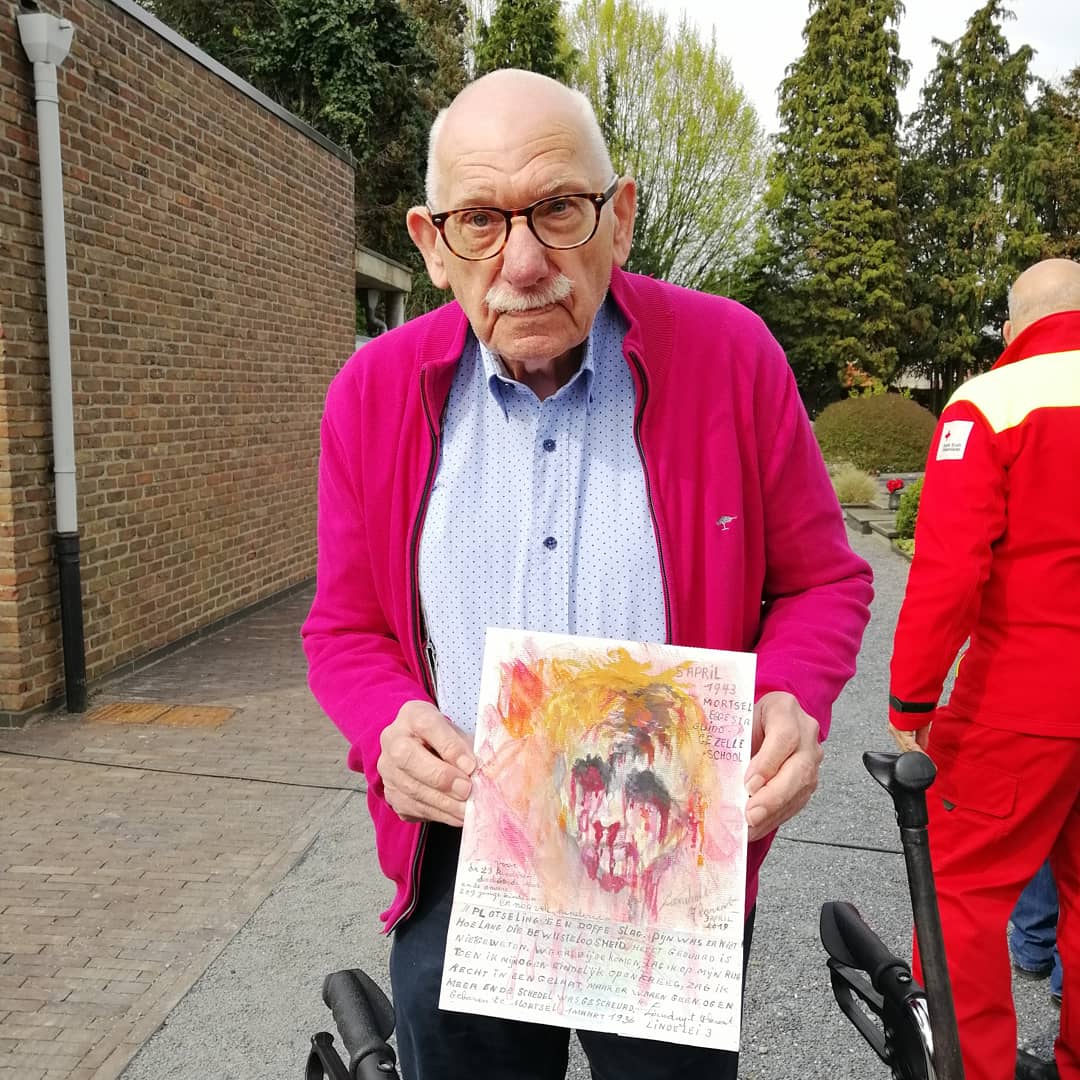 Getuige Flor Landuyt toonde na de plechtigheid de tekening die hij dit jaar maakte. Hij heeft jarenlang gezwegen over wat hij meemaakte in de Guido-Gezelleschool. In Tranen over Mortsel stond al een tekening van de puinhoop waarin hij urenlang vast zat. Nu is er nog een indrukwekkender kunstwerk/getuigenis bijgekomen…