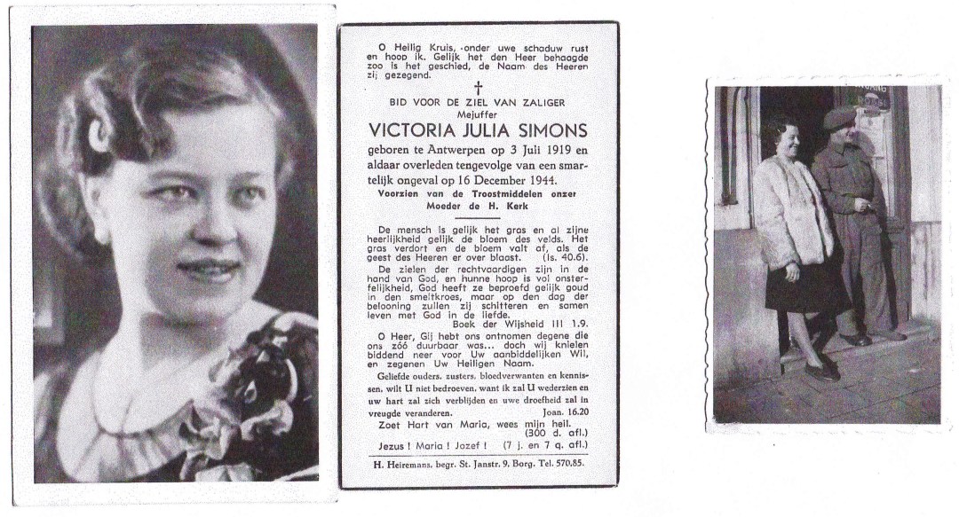 Victoria Simons had een Brits lief, zo vertelt zus Maria (°1940) bijna 75 jaar later: ‘Ons Vic heeft mij eigenlijk grootgebracht. Ze was 21 jaar ouder dan ik. Ik was een echt nakomertje. Onze ouders baatten een druk café met duiventil op de Draakplaats 3 in Zurenborg uit en Vic speelde zo een beetje mijn mama. Na de bevrijding leerde Vic Bill kennen. Hij was verantwoordelijk voor de aanvoer van medische goederen in Antwerpen-Oost. Hij nam wel eens een chocolaatje voor mij mee.’ Die zaterdag vertrokken ze arm in arm naar de cinema. Ze kwamen nooit thuis.