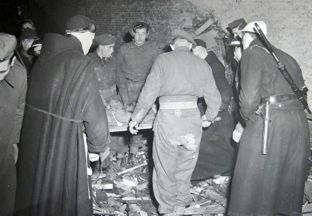 ‘Na een tijdje werd een smalle streep licht zichtbaar. Met alle kracht die Petrus had begon hij stenen en stukken beton te verplaatsen naar de kleine ruimte tussen ons in. Ik nam het aan tot er een berg puin tussen ons in lag. Op die manier wonnen we telkens enkele centimeter die ons dichter bij de vrijheid brachten. Het heeft enkele uren geduurd voordat we frisse lucht konden inademen. We waren beiden bedekt met een korst van bloed, steen- en kalkgruis. Buiten troffen we een afgrijselijk tafereel aan. Reddingsploegen van de brandweer en van de geallieerde troepen waren ter hulp geschoten en brachten de doden naar buiten.Dank zij onze plaats onder de balkons hadden wij geen ernstige verwondingen opgelopen.’