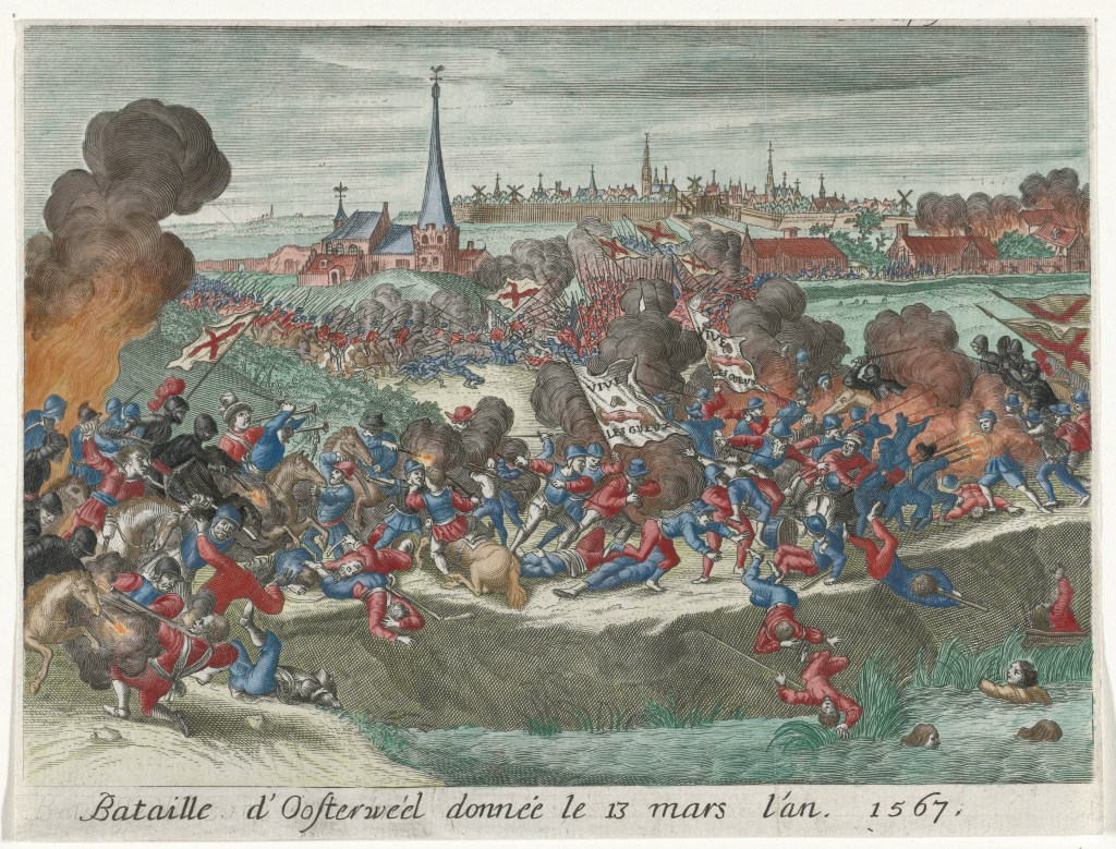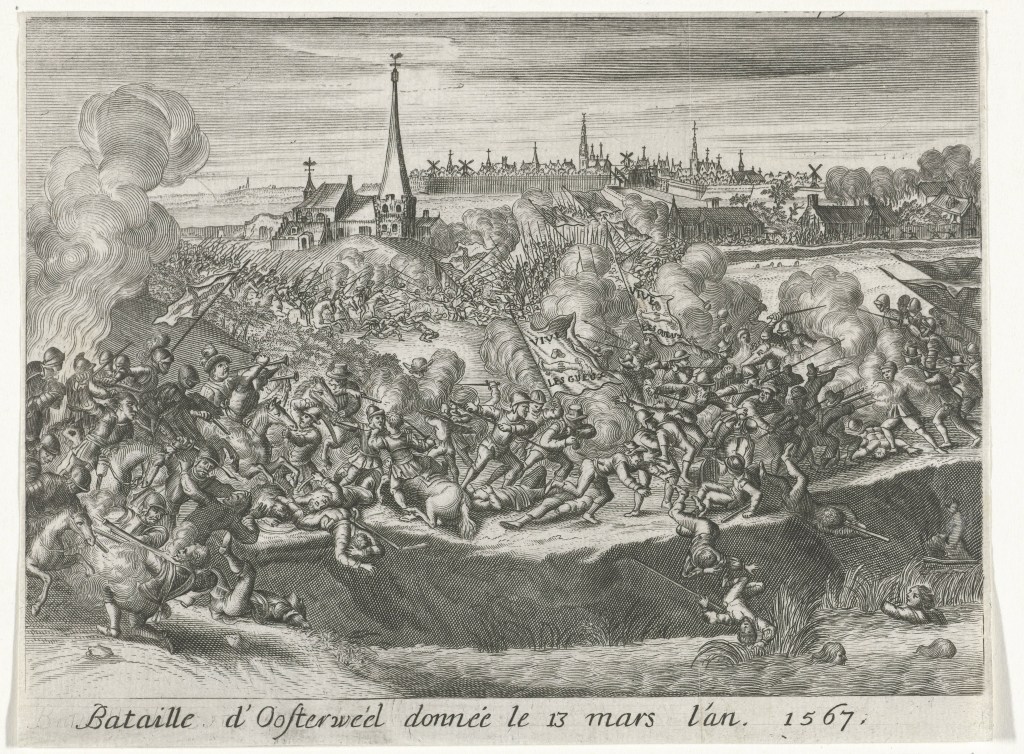 Ik geef graag een kleine uitleg bij de twee grootste veranderingen in de paperback. De eerste is de toevoeging van een stukje over de Geuzenhoek bij Horebeke en Oudenaarde, iets wat ik beloofd had aan enkele Oost-Vlaamse lezers en de nazaten van Jacob Blommaert. Dit stuk was in de eerste editie gesneuveld tijdens het lange proces van schrijven = schrappen. Maar deze keer vond ik net ruimte genoeg om het alsnog te kunnen opnemen. De tweede is uiteraard de nieuwe cover. Die is niet zomaar gekozen. Het is een populaire zeventiende-eeuwse historieprent van de Slag van Oosterweel (13 maart 1567), de geuzenslag bij uitstek die eindigde in een bloedbad onder de opstandelingen. Terwijl de geuzen vechten om te overleven, hun vlaggen heroïsch laten wapperen en ze ‘vive les gueux!’ brullen, zie je op de achtergrond de Antwerpse skyline, vanwaar de stadsbestuurders, Willem van Oranje en de verschrikte familie van de strijders op de stadsmuur machteloos toekeken hoe het rebellenleger door de regeringstroepen werden afgeslacht en de Schelde in gedreven. De gravure is toegeschreven aan Romeyn de Hooghe en omtrent 1670 gemaakt als herinnering aan de historische slag. Hieronder zie je het origineel uit de collectie van het Rijksmuseum (RP-P-OB.78.957).