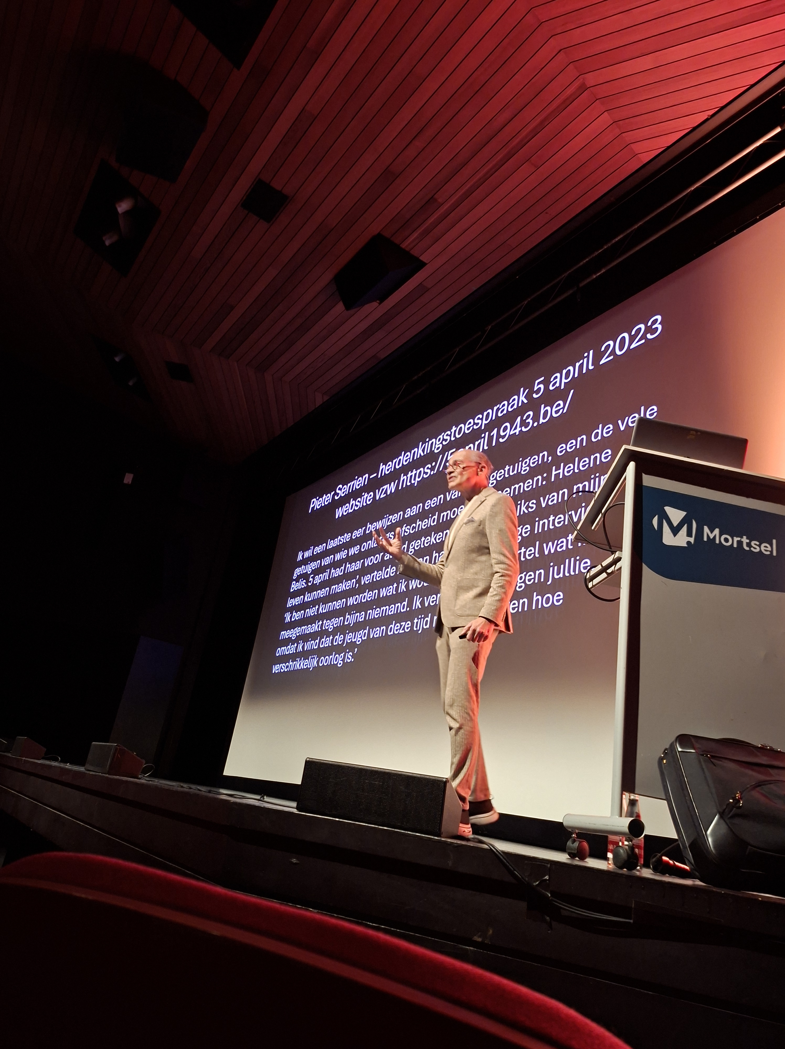 Gisteren gaf Peter Adriaenssens de jaarlijkse 5april-lezing in het CC van Mortsel, voor de vijfde keer georganiseerd door de stad en onze vzw 5 april 1943. Als voorzitter mocht ik de bekende kinderpsychiater en Mortselaar inleiden. Ik vertelde het bijzondere verhaal van Helene Belis. In de zaal zat een 93-jarige overlevende van het bombardement die nog met Helene op school had gezeten. Ze was voor de eerste keer in haar lange leven naar een herdenkingsactiviteit gekomen. Komende zaterdag 4 april om 11 uur is iedereen welkom op het ereperk in Mortsel-Dorp voor de jaarlijkse herdenkingsplechtigheid.