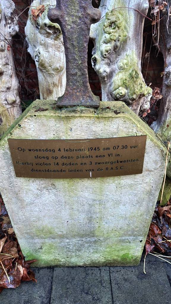 Lezer Peter Severyns wees mij op de overwoekerde gedenkplaat van een V1-inslag op 4 februari 1945 te Kalmthout, tussen het natuurreservaat en de N111. Veel weten we er niet over, maar hij maakte deze foto, waarvoor dank! Lokaal gaat het verhaal rond dat er meer slachtoffers vermeden werden omdat toevallig een deel van de daar gelegerde militairen op patrouille was.