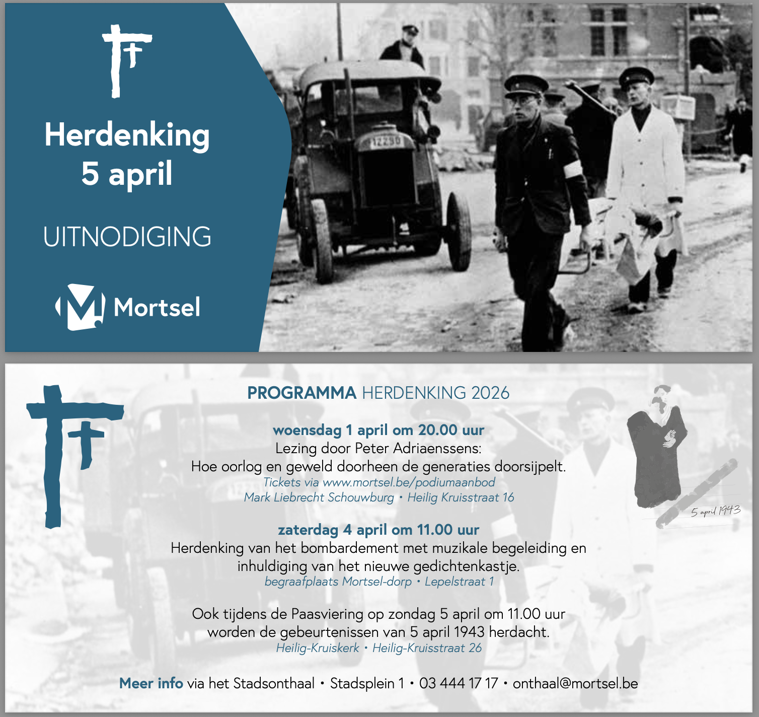 Onze vzw 5 april 1943 en de stad Mortsel nodigen iedereen uit om mee het dodelijkste bombardement uit onze geschiedenis te herdenken. Om 11u aan het ereperk op de begraafplaats van Mortsel-Dorp.