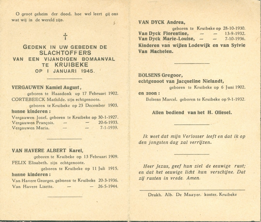 De eerste dag van 1945 eindigde rampzalig voor Kruibeke. Rond kwart voor tien sloeg er plots een V1 in op de Molenstraat, die enkele weken eerder al getroffen was (meer info). De bom was nog dodelijker: veertien mensen verloren het leven.