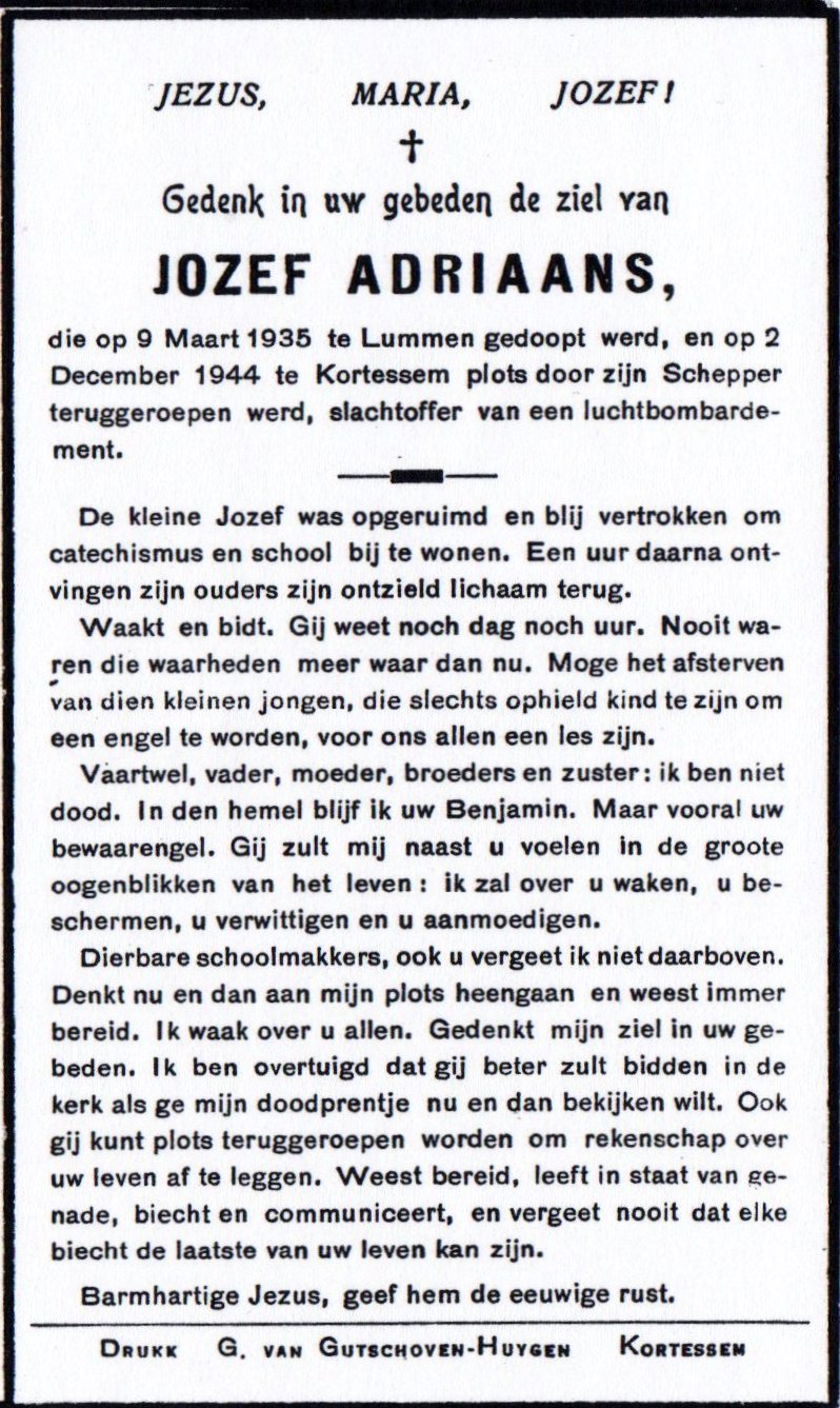 Hij zag Jefke Adriaans met zijn fiets naar de mis gaan, hij zou binnenkort zijn Plechtige Communie doen. Toen Palmers de bom hoorde, riep hij de jongen toe om zijn fiets neer te gooien en in de gracht te gaan liggen. Er stond water in, maar ze springen beide in de gracht en gingen elk tegen een kant liggen. Jef Palmers kwam er met de schrik vanaf, maar voor Jefke werd het fataal: zijn longen scheurde door de druk van de ontploffing. Hij heeft nog maar even geleefd.”