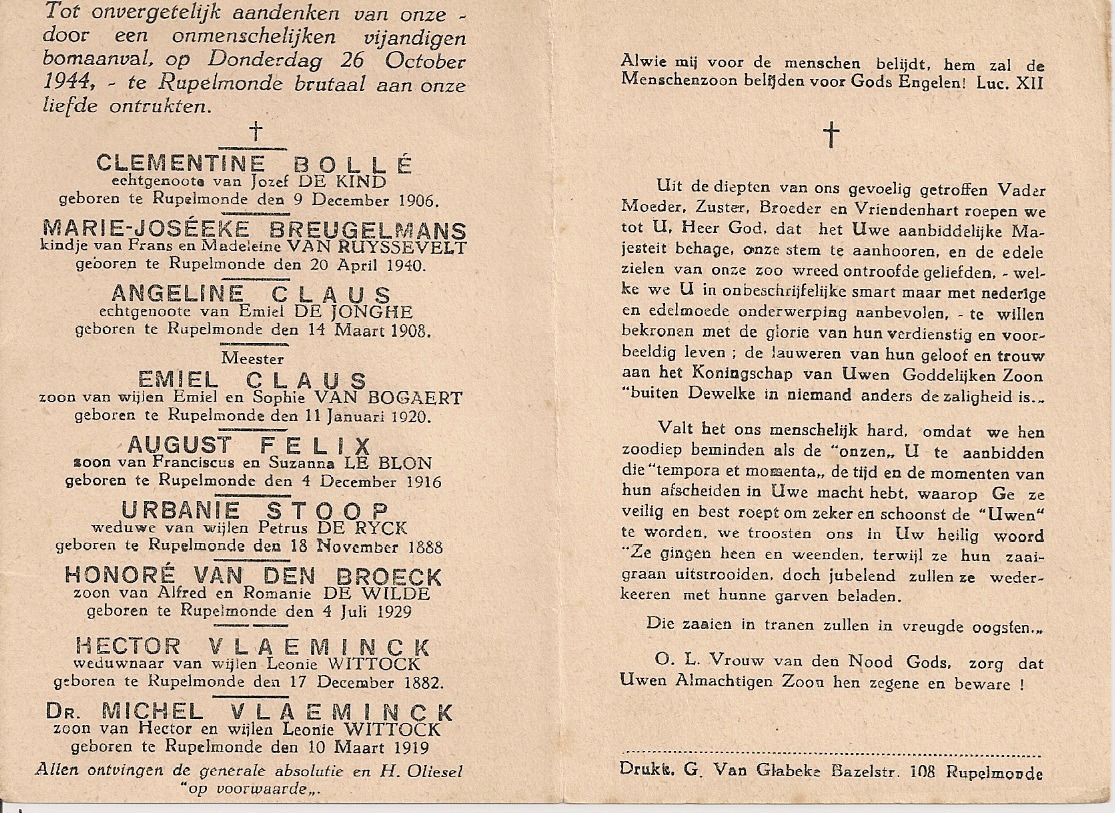 ‘Mijn moeder, Urbanie Stoop, werd onder het puin van Het Gildenhuis, in de woonplaats aangetroffen. Bij het hek vlak tegenover de achterzijde van de kerk, vonden Gustje Felix en Emiel Claus de dood. Zij hadden juist het bureel van de bond verlaten.’