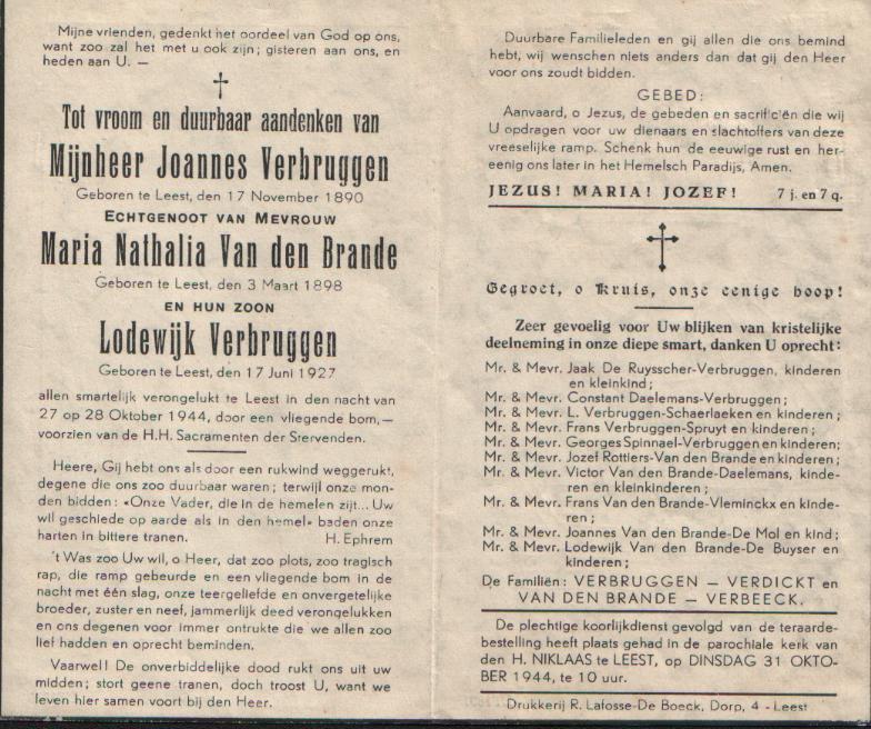 In de nacht van 27 op 28 oktober viel er een V1 op de Mechelse randgemeente Leest. Er vielen zeker drie doden, allen van een gezin. Waarschijnlijk in hun slaap verrast door de inslag.