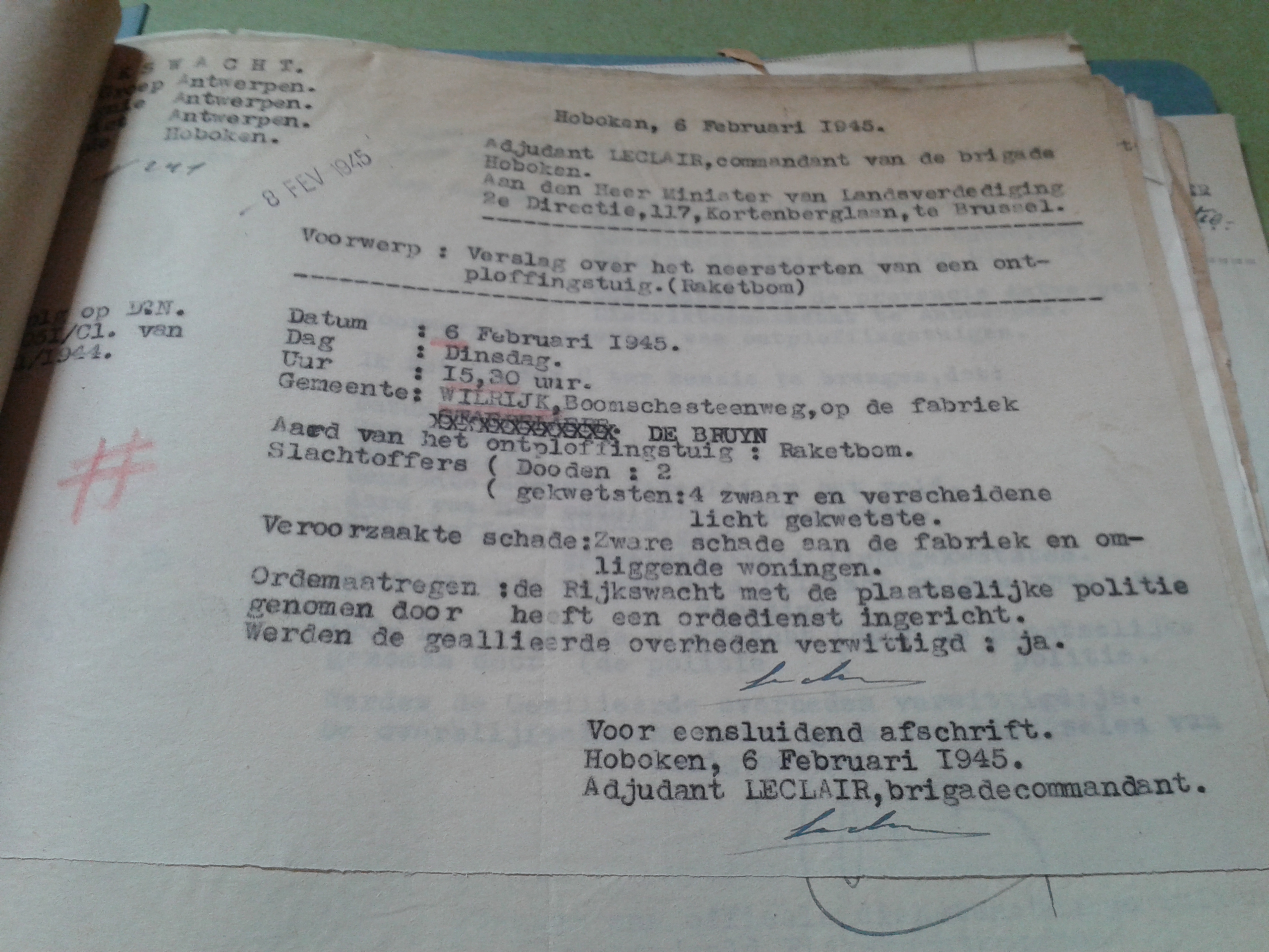 Vanuit Canada contacteerde Frank Van Eynde (°1932) mij. Hij vertelde hoe hij opgroeide in Wilrijk. Tijdens de oorlog was het oorlogsgeweld nooit veraf: ‘Ik herinner me het bombardement op de Erla (Mortsel, 5 april). Toen kwamen de vliegtuigen over Wilrijk gevlogen.’ Maar de echte ellende sloeg pas toe tijdens de laatste oorlogsmaanden: ‘Mijn ouders hadden een zogenaamd baancafé op de hoek van de Boomsesteenweg en de Kleine Steenweg. Op 6 februari 1945 viel een raket op die hoek. Achteraf viel het me op hoe beperkt de schade was. De hoek van de Boomsesteenweg, Kleine Steenweg, Jules Moretuslei was vernietigd, maar even verderop was er niets te merken. Ik was toen toevallig niet thuis: ik was naar Aartselaar gestuurd door vader om een wedstrijdduif vrij te laten. Mijn grootmoeder en tante werden op slag gedood. Grootmoeder heette Rosalia De Win (°1866, Westerlo). Ik kan me de naam van mijn tante niet meer herinneren. Ze was niet getrouwd, maar leefde al twintig jaar samen met mijn nonkel. Omdat ze volgens de priester in zonde leefde, weigerde men haar een begrafenis. Mijn andere tante Sylvia (°1909) was ernstig gewond door het rondvliegend glas. Ik heb geen foto’s van mijn grootmoeder of tante, ook niet van het puin. Het boek brengt de herinneringen weer tot leven…, ook al leef ik reeds 53 jaar in Canada. Misschien is het daarom dat ik nog steeds een duivenliefhebber ben.’
