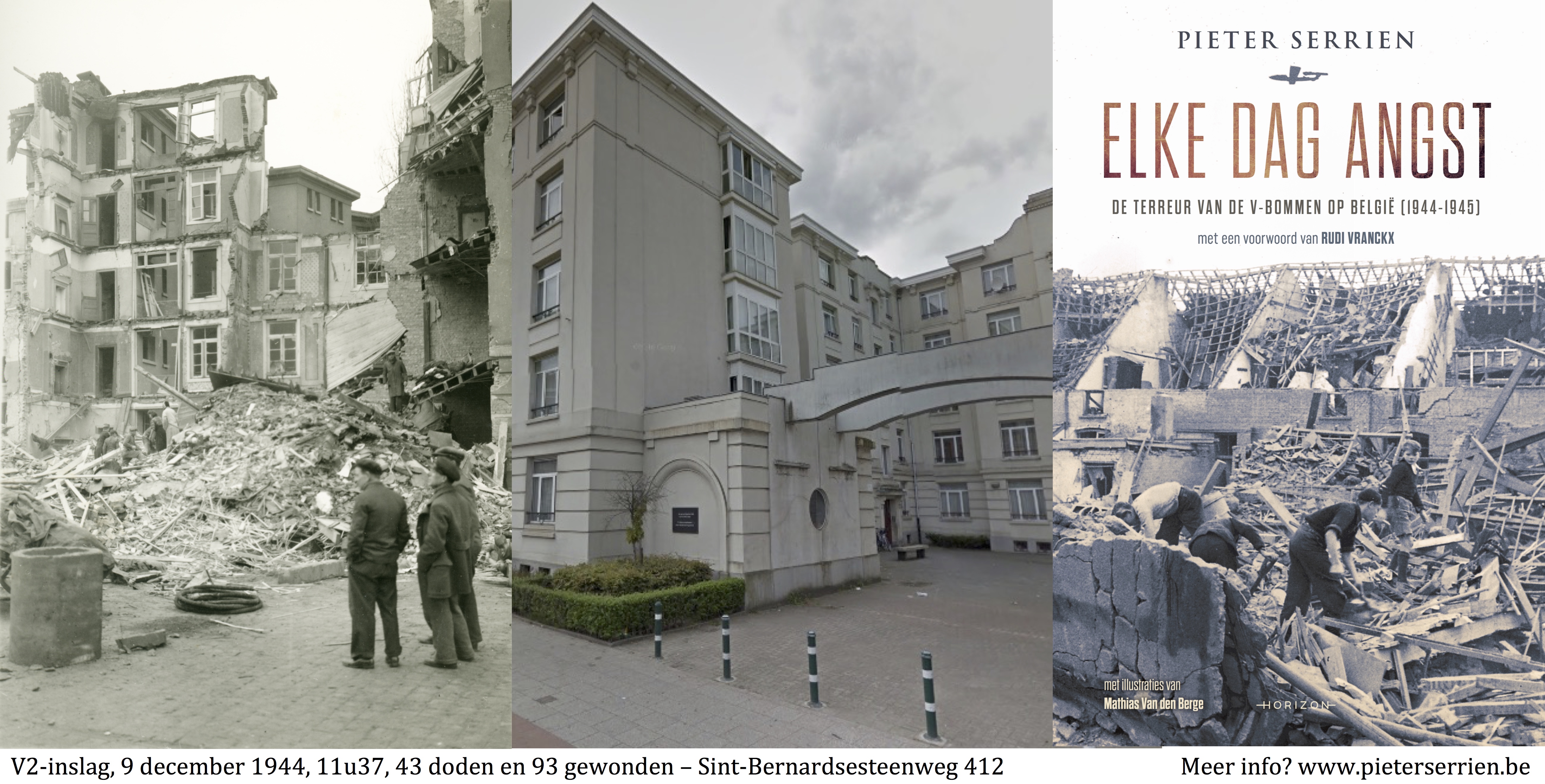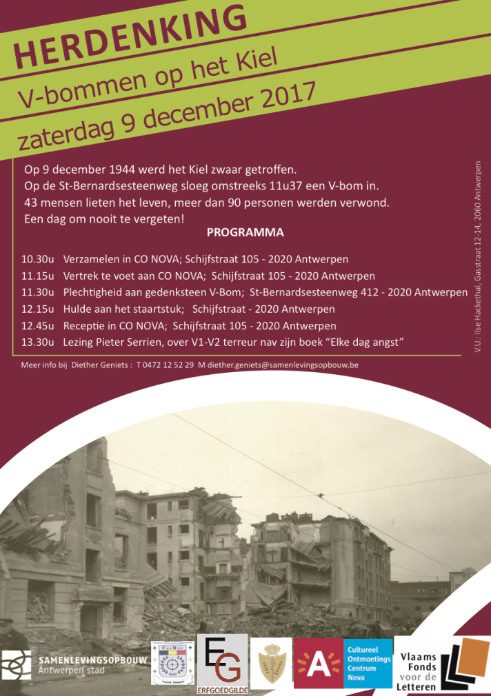 Op 9 december 2017 geef ik mijn laatste lezing van 2017. De vijftiende keer dat ik dit jaar spreek, zal bijzonder worden. Sinds enkele jaren is er een herdenking voor de V2-inslag van 9 december 1944 op de Sint-Bernardsesteenweg op het Kiel. Ik zal na de herdenking een lezing geven over de V-terreur. Allen zeer welkom om 13u30, CO Nova Schrijfstraat 105. Of eerder om 13u30 op het herdenkingsmoment in de Sint-Bernardsesteenweg 412. (meer info, klik op afbeelding hiernaast)