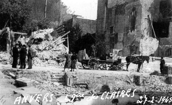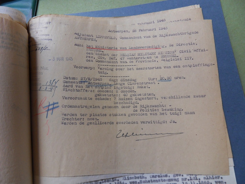 Om 20.34 uur sloeg een V2-raket in ter hoogte van het kruispunt van de Lange en Korte Klarenstraat in het Antwerpse centrum. De vernieling in de zijstraat van de Meir was groot. Er waren dertien doden en negentien gewonden. Er werd een geheim verslag opgemaakt, waar zoals vaak een zware onderschatting van het aantal slachtoffers werd gemeld. Weet je meer over deze inslag? Graag reacties!