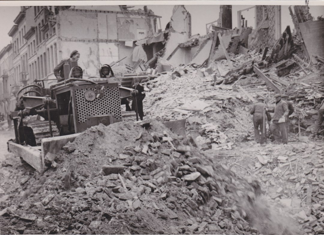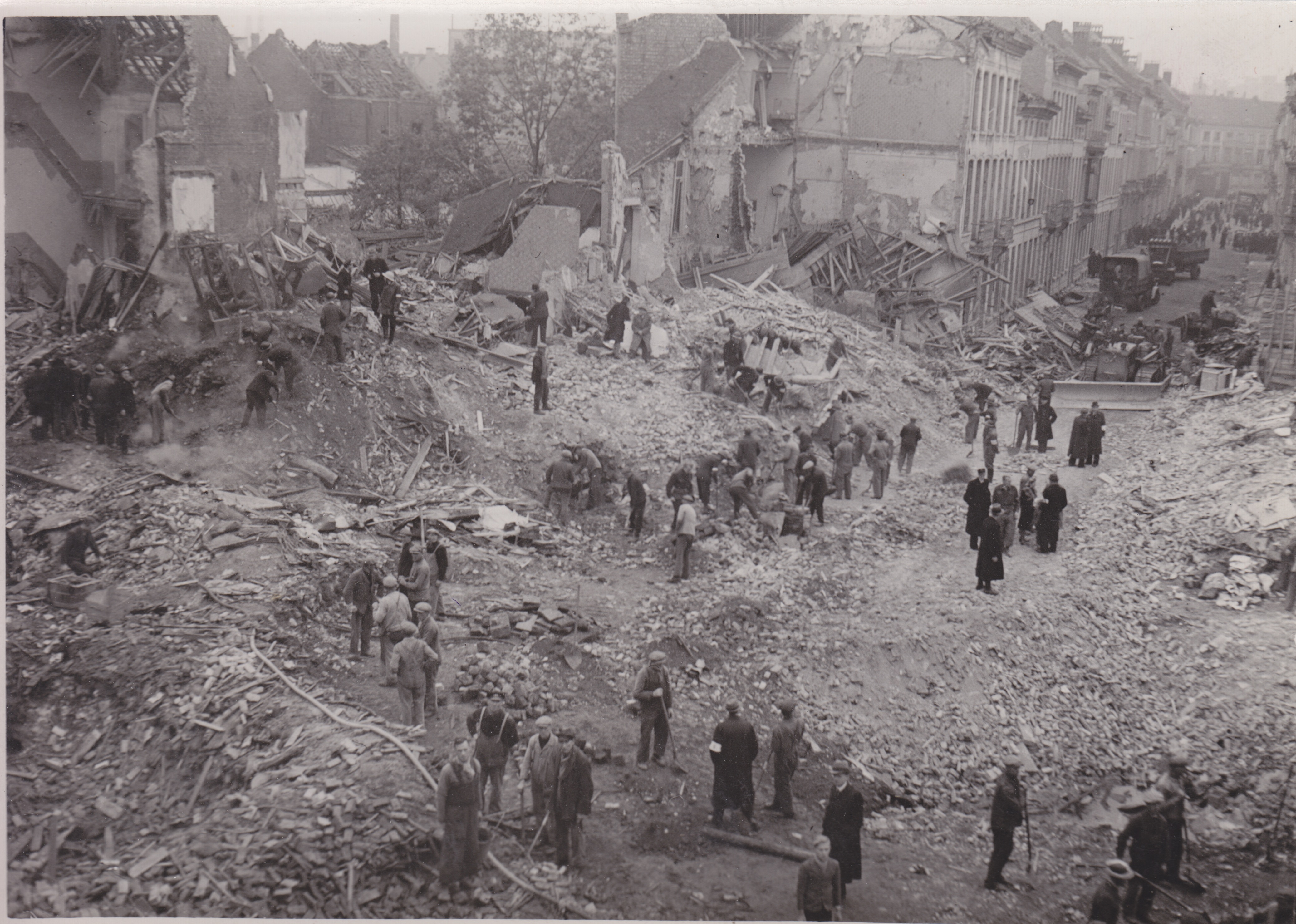 ‘Het was spectaculair’, vertelt brandweerman Pierre Lepomme. ‘Die bom was in het midden van het kruispunt gevallen en de vier hoeken waren weg. Toen we daar aankwamen, was het een hoop puin.’ Ook de Amerikaanse soldaat Kenneth Hartman (°1921) was bijzonder aangedaan: ‘Gebouwen van drie verdiepingen waren volledig weggeslagen, waardoor de aanpalende woningen aan één kant geen buitenmuur meer hadden. De mensen konden nergens heen, waardoor regen en wind vrij spel hadden in hun woonkamer.’ Maria De Roeck (°1928) woonde in de nabijgelegen Langstraat: ‘De inslag was erg beangstigend, hij was deze keer wel heel dichtbij. Ik vroeg me af of we dit wel zouden overleven. Alles daverde en overal vielen stukken naar beneden. Het was paniek alom. Op elke hoek van het kruispunt was een winkel of een café. Mensen die we tevoren nog gezien hadden, waren allemaal dood. In heel de buurt heerste een bedrukte, meevoelende sfeer. Er groeide zelfs een soort band tussen de getroffenen.’