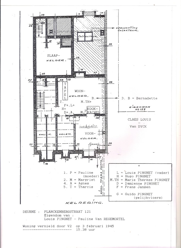 Ook in Elke dag angst (p. 341-343) staat de uitgebreide getuigenis van de familie Pingnet. ‘Ik heb bijna geen herinneringen aan die dag’, vertelt Tharcis Pingnet (°1939). ‘Alleen dat wij in de kelder zaten. Voor ons was het niet haalbaar om uit Antwerpen te vertrekken, zoals vele anderen deden. Mijn broer Guido stierf bij de inslag omdat hij net boven was om naar het toilet te gaan. Maar ook in de kelder vielen er doden. Ik zat heel lang vast in het puin. De hulpverleners wilden stoppen met zoeken omdat ze niets meer hoorden. Maar een buurman zei dat ik er nog onder moest liggen. Toen hoorden ze mij zachtjes kreunen.’