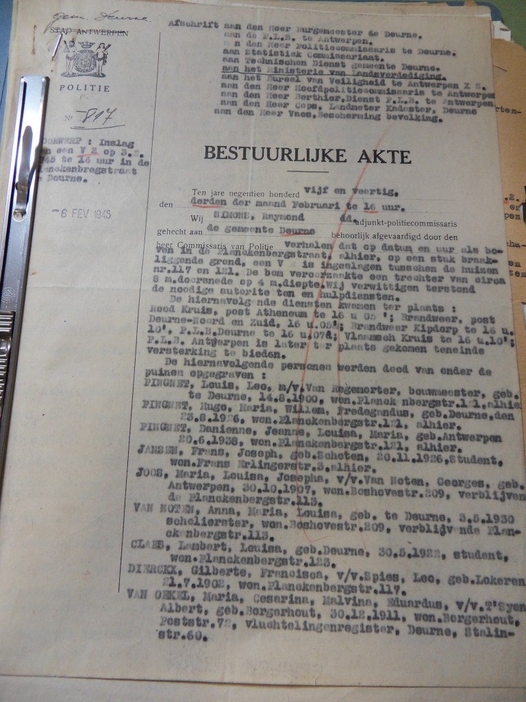3 februari 1945 was een pijnlijke dag voor Antwerpen, ook in Hoboken en Deurne. In het laatste stadsdistrict doodde een V2-raket zestien mensen in de Plankenbergstraat 117-121. Een zeldzame Bestuurlijke Akte geeft ons meer informatie, onder meer de namen van de doden en gewonden.